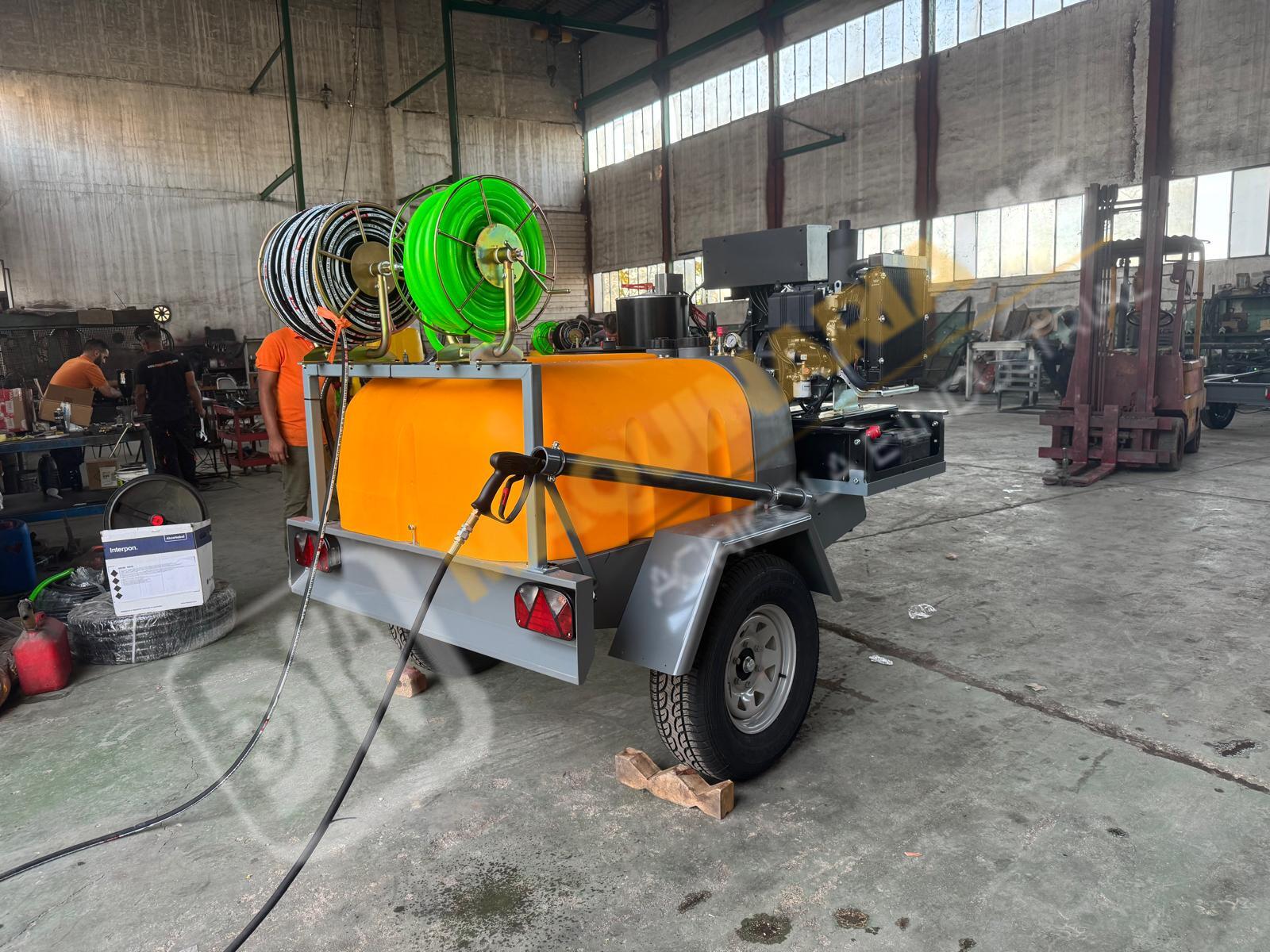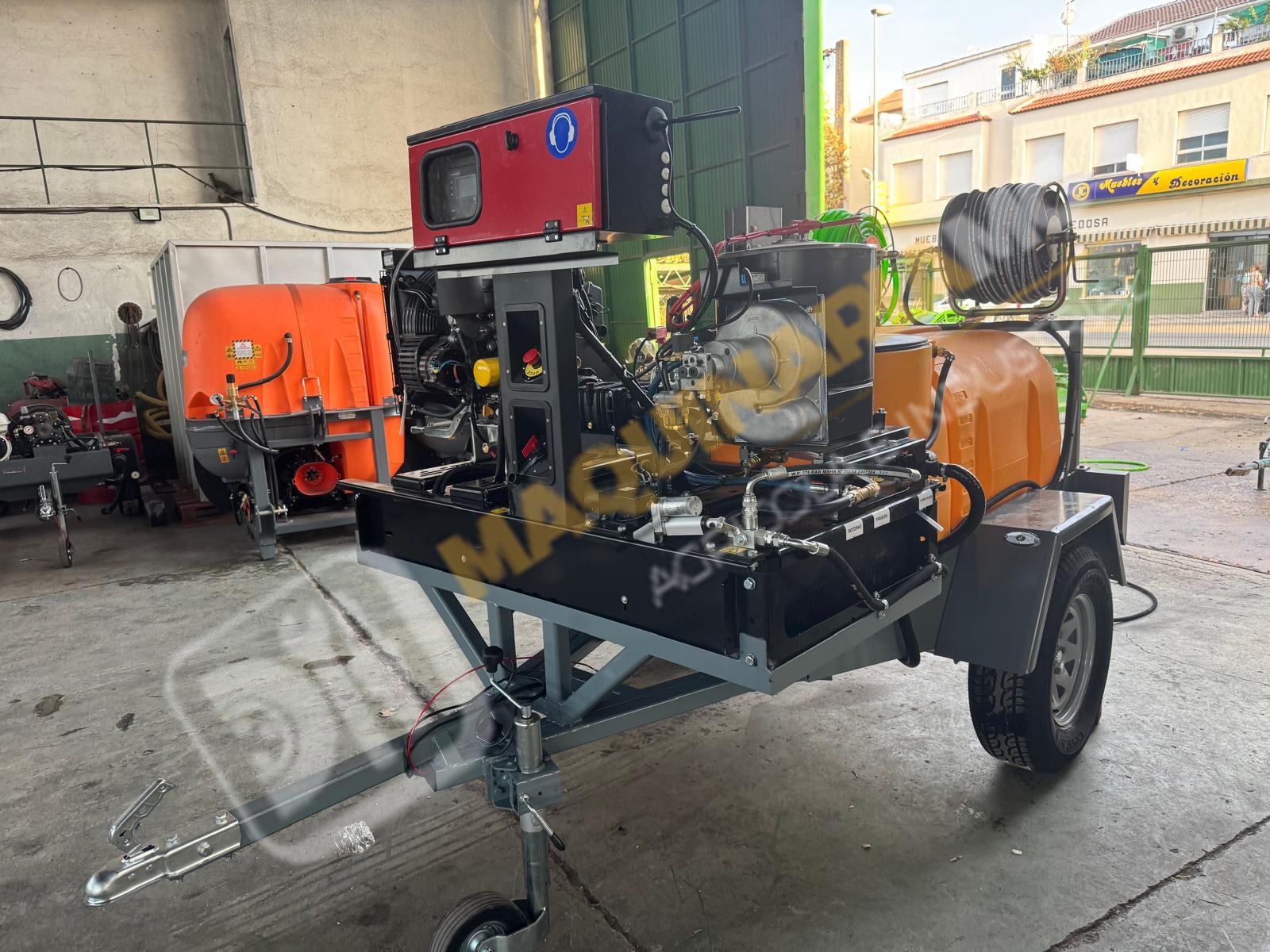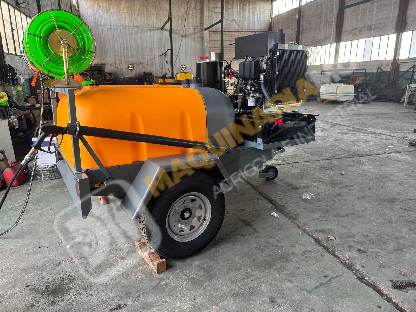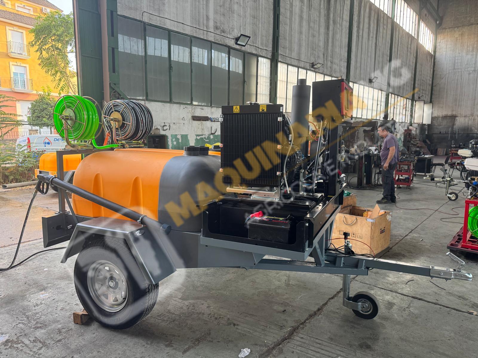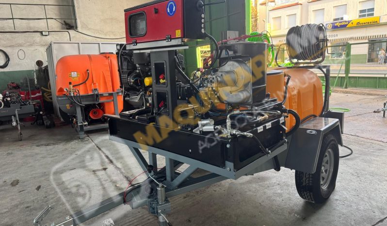 Equipo de limpieza con agua caliente 300 bares. Motor bicilindrico diesel, calentador para el agua diesel. Motor 20 CV. Bomba hasta 300 bares con 20 litros de caudal. Sistema de arranque y pare electrónico por ordenador. Motor refrigerado por agua. Enrollador de 100 metros de manguera. Pistola de limpieza profesional. Carro homologado con 1.000 litros de capacidad. Enrollador con 20 metros de manguera de suministro. Depósito de 100 litros para gasoil. Eje todoterreno de 1.500 Kg. Equipo independiente de inyección de producto con motor HONDA y bomba de 60 litros. Somos fabricantes y disponemos de varias capacidades. Para más información puede llamarnos al 627 477 965